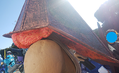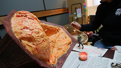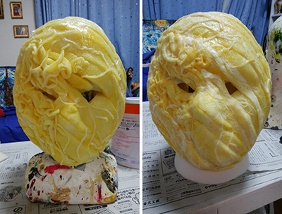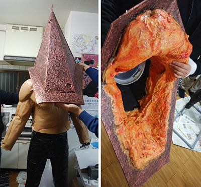 TKCさんが筋肉スーツをつくってる間、私はフッシーさんを手足の如く使い、三角様の脳みそ部分を制作。これ脳みそなのかな?とにかく、うにゃうにゃ。