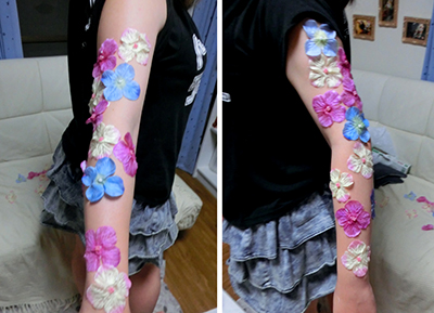 食後に笑うせぇるすまん見ながら、ろじうらちゃんの腕に花をつける。