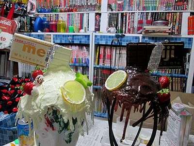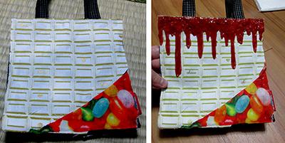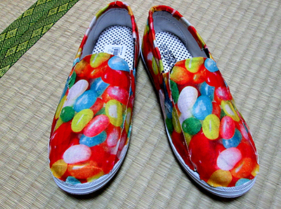 頭にチョコ乗せるから、なんか靴も可愛いの履きたいと思い、お菓子の柄の布を張って靴を制作。