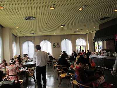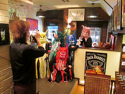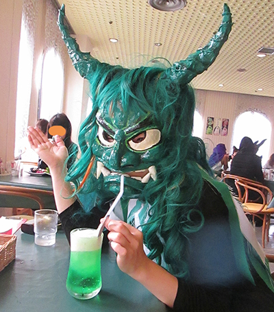 今回からパレードのコースが大きく延長したので、マイクロまで出て、スタート地点に移動なのですが、スタート地点は川崎労働会館前で、中の喫茶店、レストランでは、パレード前の化け物たちが腹ごしらえ。