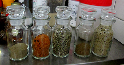 右からクレージーソルト、ガランマサラ、粗びき胡椒、七味、普通の胡椒