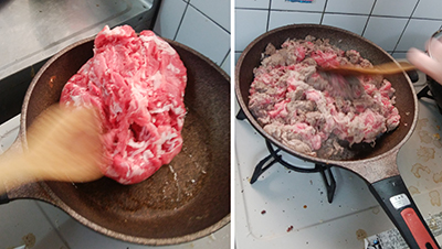 ちゅんちゃんはこま切れ肉を1㌔持ってきて、うちで調理。