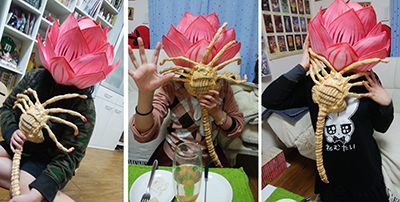 そして異形頭のkayaさんがご自身の仮装の頭持ってきてくれて、みんな蓮頭体験。