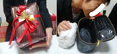 じょじ君のプレゼントがかれんさんに、いったのですが、ジャンル違いのおしゃれポーチが交換されるみたいな図。どちらもおしゃれだな。。