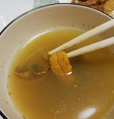イチゴ煮は、アワビとウニのお吸い物です、ウニが花開くさまが野イチゴのようだというところから、この呼び名だそうです。帆立の紐と昆布とアワビの切り身で出汁を取り、ウニを数枚。。