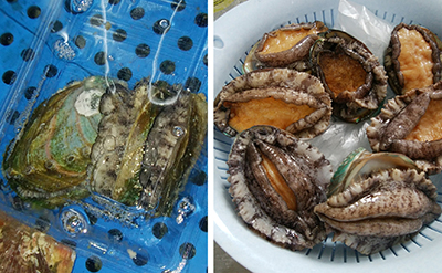 からの、殻向き、→鮑ステーキの用の切り込み入れ体験。