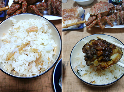 午後になって実家から蟹が送られてきたのですが、中に貝柱の乾物が入ってたので、急遽炊き込みご飯作ることに。研いだ米に、二時間ほど昆布と乾物ぶち込み放置、少しのみりんと醤油で味付けテキトウにしたら、この出来ですよwやべぇやつですよコレ