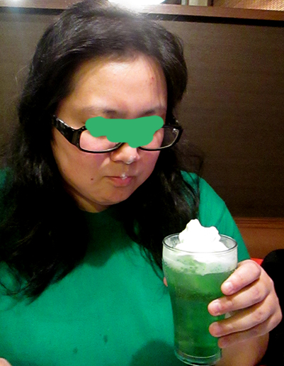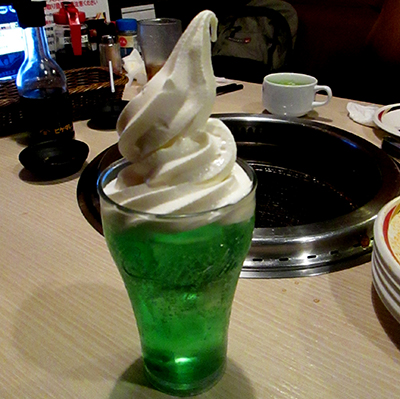 で、ドリンクバーのメロンソーダと、ソフトクリームを合
