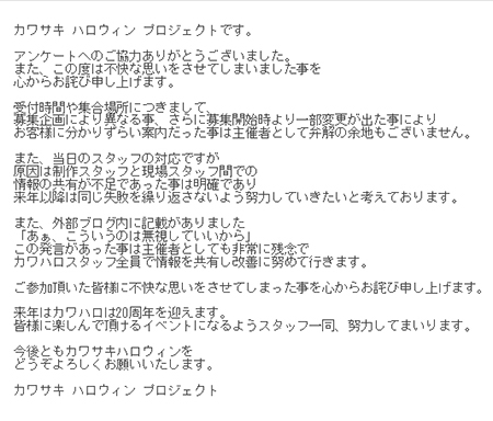 実際私の友人は、私が誘ってカワハロに出たことで、酷い暴言をスタッフに吐かれて傷ついていました。